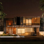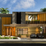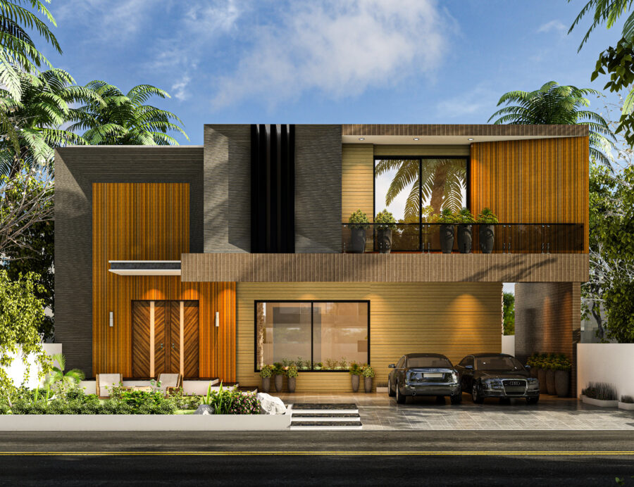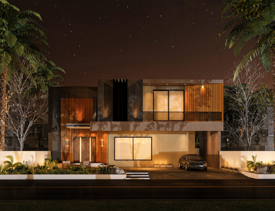 This stunning 1 Kanal residence by ORA Architect showcases a perfect harmony of modern design and natural warmth. The façade features a sophisticated blend of textured wood panels, sleek concrete finishes, and strategic lighting that highlights the architectural geometry. Expansive windows invite soft ambient light, while the integrated landscaping and open car porch enhance curb appeal. The balanced horizontal and vertical lines give the home a bold yet elegant presence, making it a true statement of luxury and contemporary living.