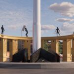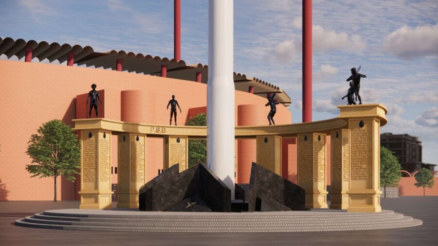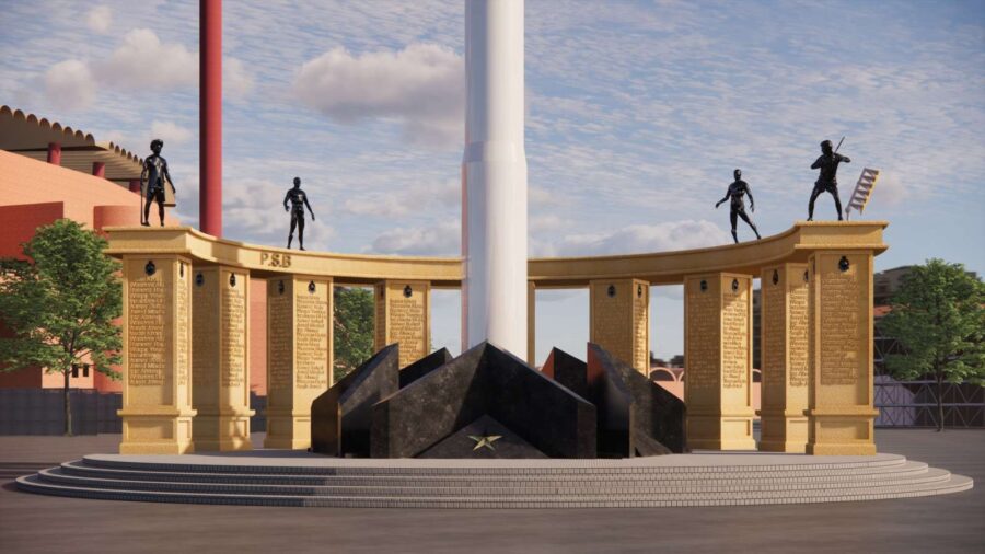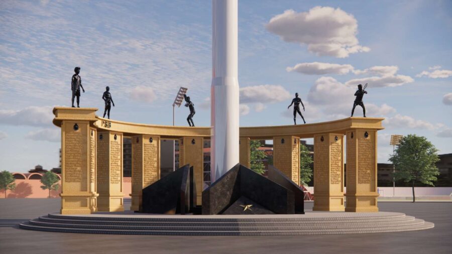 This architectural masterpiece at Gaddafi Stadium, Lahore, serves as a powerful tribute to Pakistan's rich sporting legacy and patriotic spirit. Designed as a symbol of unity and pride, the monument features a towering national flag surrounded by a semicircular colonnade engraved with the names of national sports heroes. Sculptures of athletes atop the columns represent strength, discipline, and dedication. At the base, angular black stone forms evoke resilience and the unwavering foundation of the nation. This landmark not only celebrates the spirit of sportsmanship but also honors those who have elevated Pakistan on the global stage.