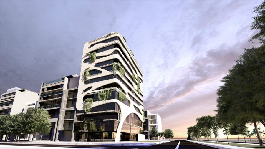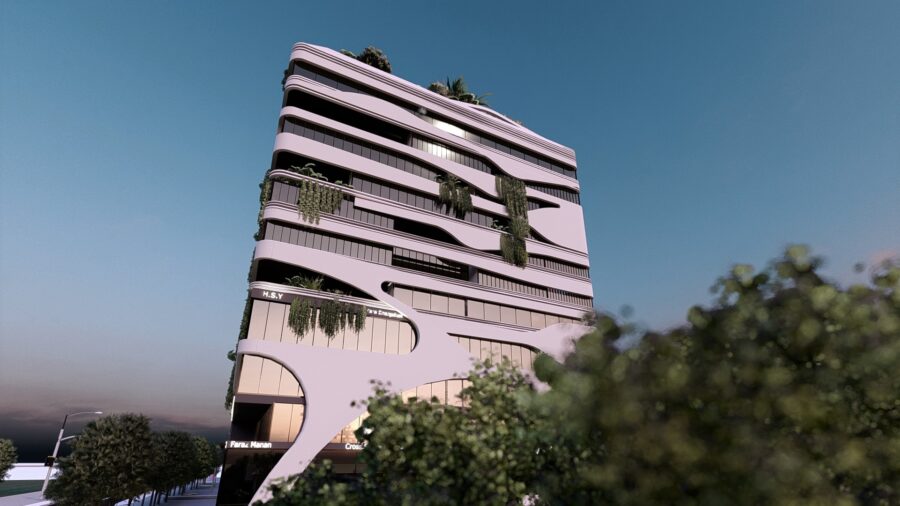 Rising with elegance and innovation, this Ground+12 tower designed by Ora Architects redefines urban architecture. The façade features organic, flowing lines with integrated green pockets, creating harmony between futuristic design and sustainable living. This dynamic structure is crafted to house modern residential units and commercial spaces, optimized for light, ventilation, and spatial efficiency. With its iconic curves and vertical landscaping, the building stands as a symbol of progress, sophistication, and eco-conscious urban growth.